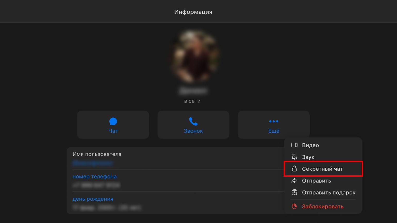 В приложении Telegram на MacBook процесс идентичный: перейдите в профиль контакта, нажмите на «Ещё» и далее на третий пункт — «Секретный чат».