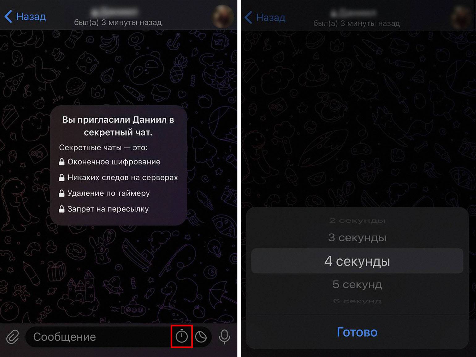 Есть таймер самоуничтожения сообщений. Его можно настроить перед отправкой сообщения. Для этого в поле ввода нужно нажать на иконку с изображением часов и выбрать, через какое время сообщения будут автоматически удаляться. Есть варианты от одной секунды до одной недели.